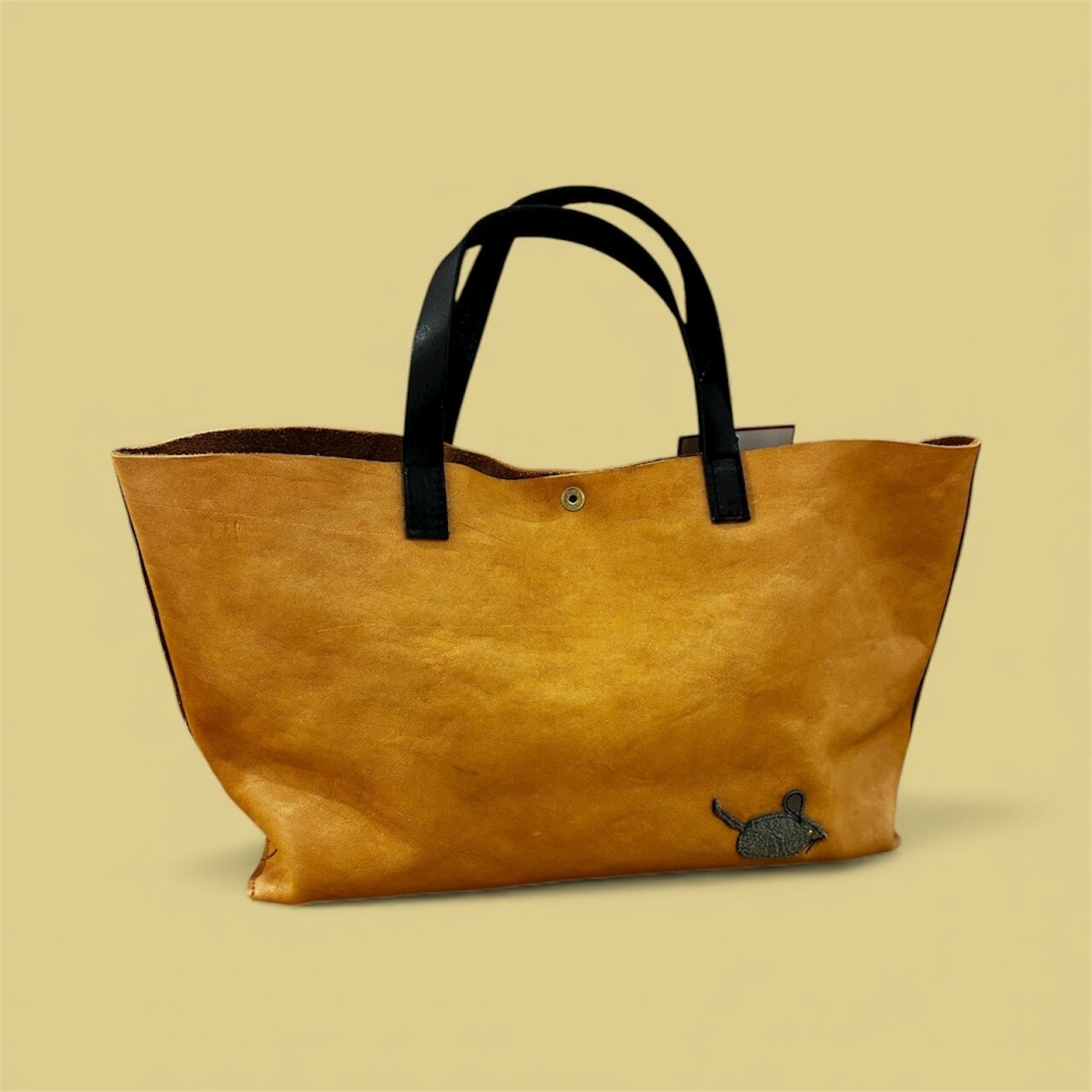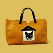 ナチュラルなヌメ革にお家に入った猫ちゃん(ゴマシオちゃん)の刺繍のユニークでファニーなミニトートです。