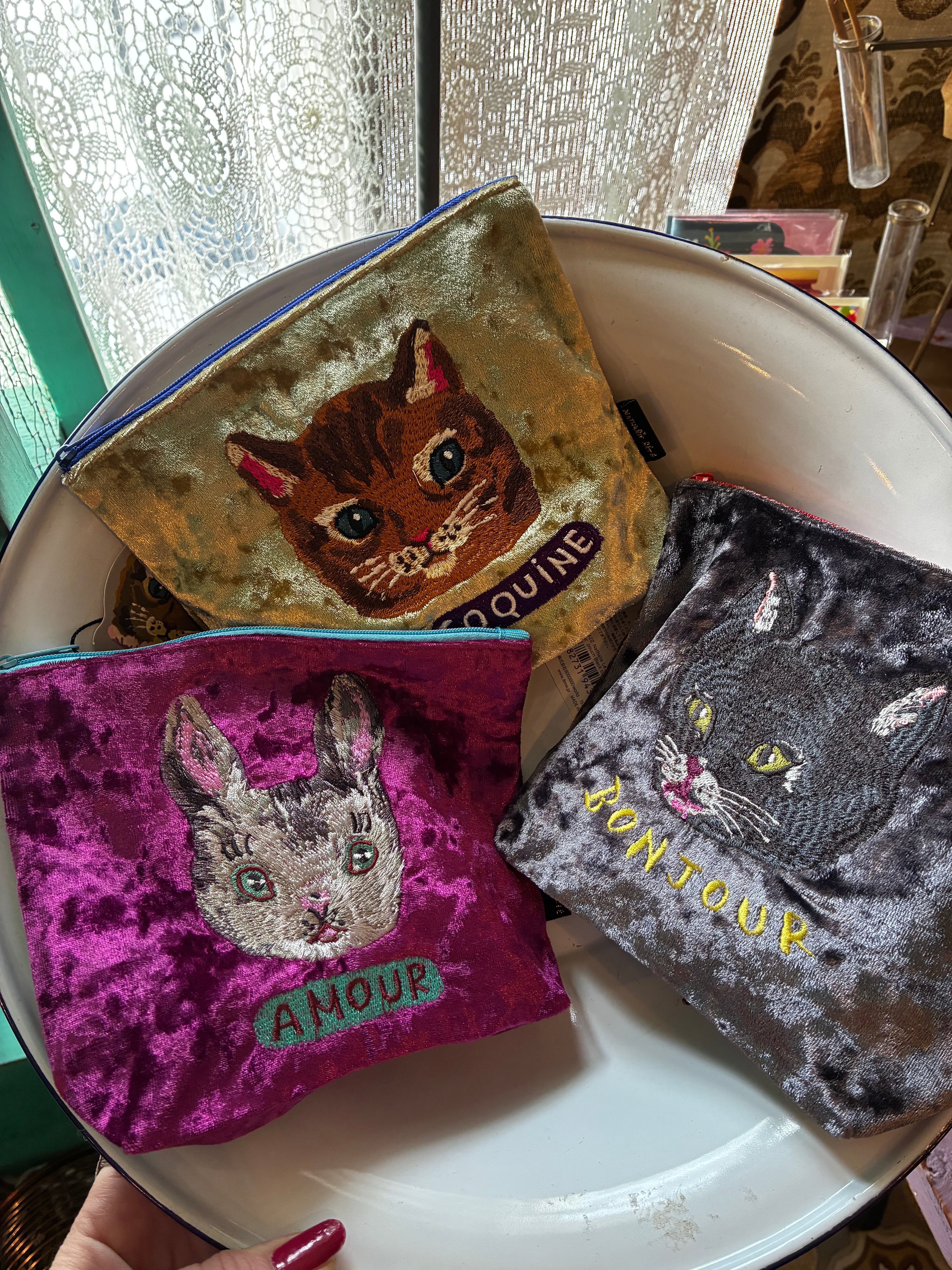 ナタリーレテさんのベロアに動物が刺繍されたポーチです。